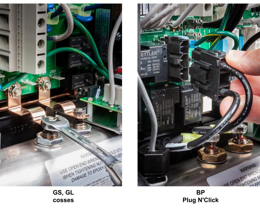 Cette version est fournie avec un câble court et une prise mâle Plug N’Click pour une connexion directe. - Version bornier (GS / GL) : prévue pour les boîtiers à platines cuivre des séries GS et GL.