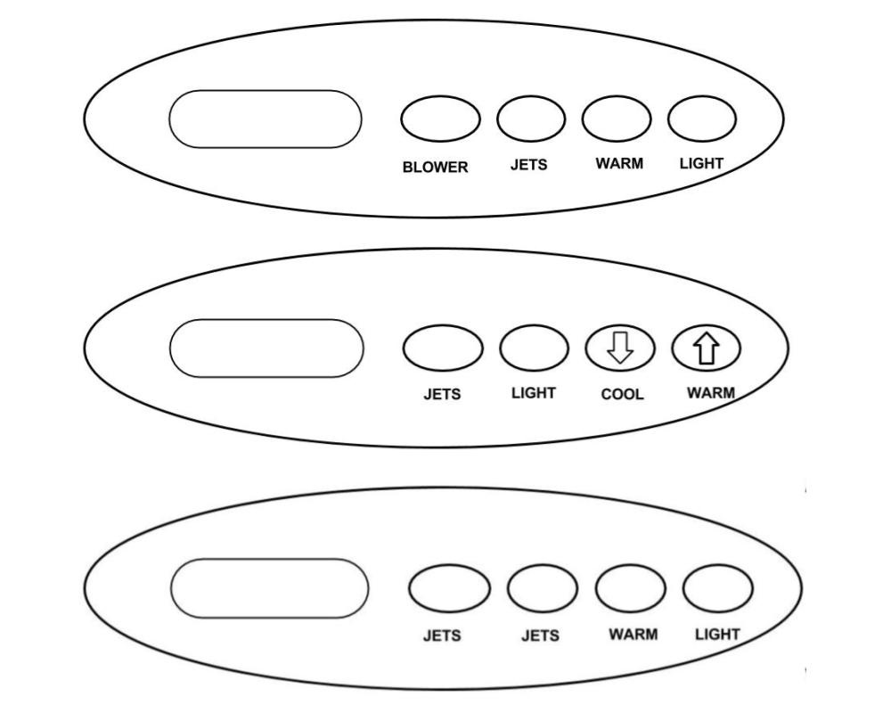 Cette membrane autocollante concerne le clavier Balboa VL200 dans sa configuration à quatre commandes. Elle existe en plusieurs implantations, couvrant les versions avec souffleur, les configurations à réglage de température séparé Warm/Cool, ainsi que les agencements à double touche Jets.