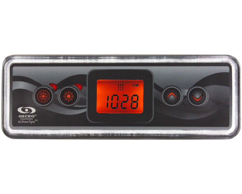 Ce clavier de commande à quatre touches est destiné aux systèmes de contrôle Gecko des séries X et Y. Installé sur la coque du spa, il offre une interface compacte pour piloter les fonctions essentielles selon la configuration de votre installation.