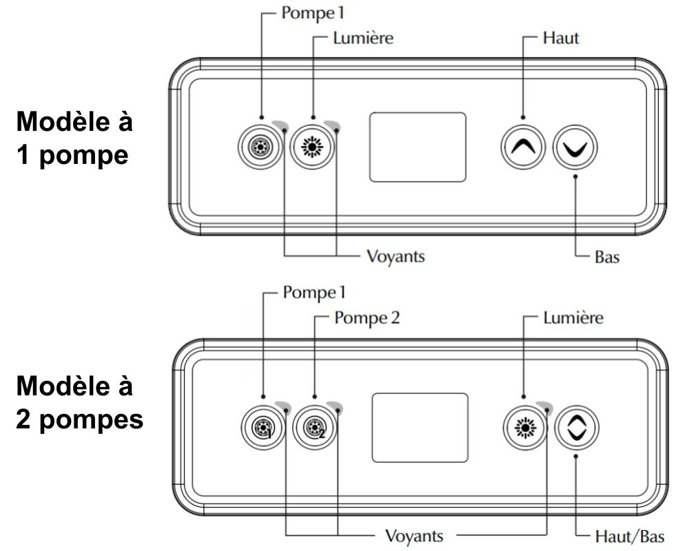 • Fonctions (version 1 pompe) : Jet, Éclairage, Augmenter, Baisser