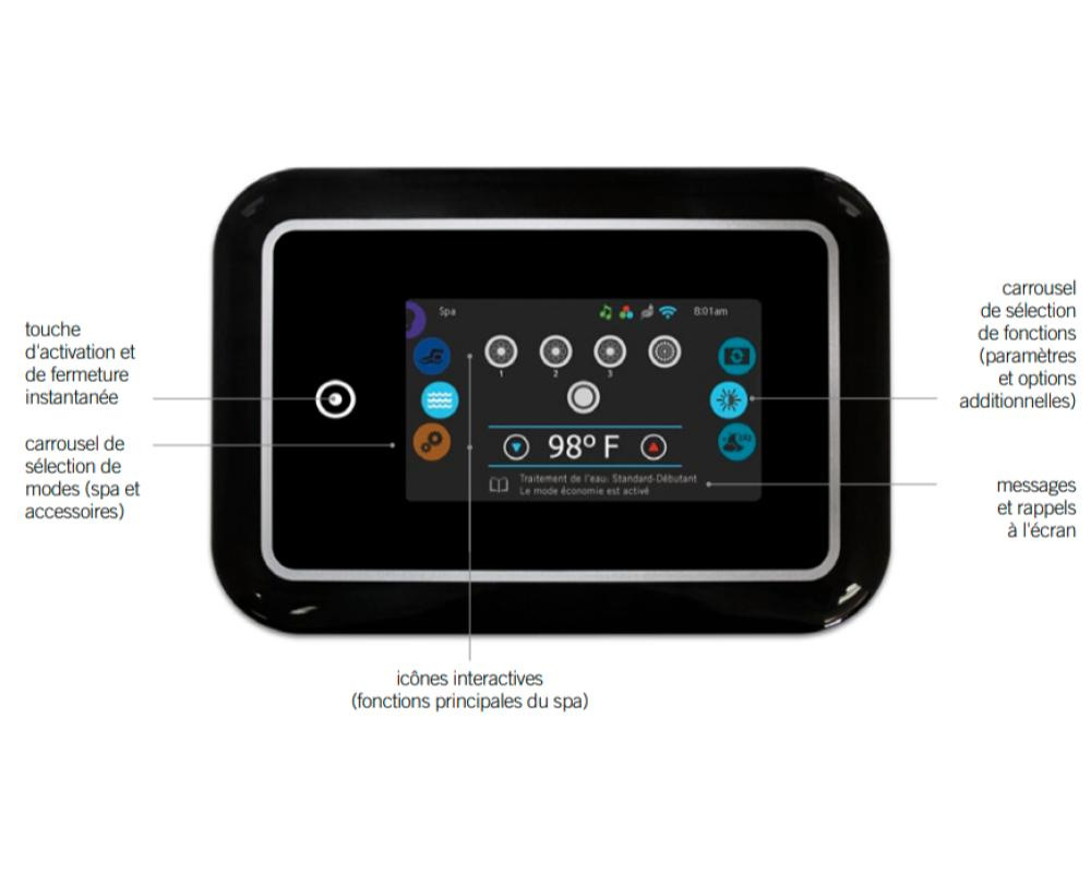 Le clavier Gecko in.k1000+ est une interface entièrement tactile dotée d’un écran couleur de 4,3 pouces et animée par un processeur de 400 MHz. Conçu pour offrir une navigation fluide et une réactivité élevée, il constitue une solution avancée pour les spas nécessitant un contrôle précis et étendu.