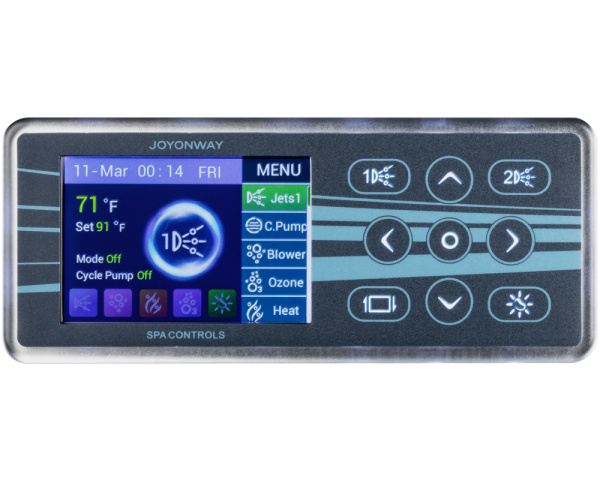 Le clavier de commande Joyonway PB555 s’intègre aux systèmes de contrôle P68B123, P20B29, P23B32 et P25B37 pour assurer le pilotage centralisé des fonctions essentielles du spa. Son écran couleur LCD de 3,5 pouces affiche en temps réel les principales informations de fonctionnement, avec une interface large et lisible adaptée à une utilisation quotidienne.